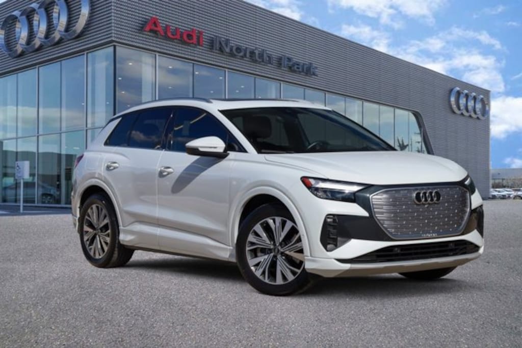 Audi North Park is proud to offer this good-looking 2023 Audi Q4 e-tron Premium Plus. Well equipped with Convenience Package (Alarm System w/Motion Sensor, Audi Advanced Key, Auto-Dimming Interior Mirror w/Compass, Auto-Dimming Power Folding Exterior Mirrors, Dual-Pane Acoustic Glass for Front Side Windows, Hands-Free Power Tailgate, Memory for Driver's Seat, Power Front Passenger Seat, Projection Light in Exterior Mirrors, SiriusXM w/360L, and Wireless Phone Charging Pad), LED Interior Lighting Plus Package, Premium Plus (Adaptive Cruise Assist w/Lane Guidance, Audi Connect PLUS, Audi MMI Navigation Plus, Audi Virtual Cockpit Plus, Heated Steering Wheel, Park Assist Plus, SONOS Premium Sound System, and Traffic Sign Recognition), Auto High-beam Headlights, Exterior Parking Camera Rear, Fully automatic headlights, Power Liftgate, Power moonroof: Panoramic, 8 Speakers, ABS brakes, Air Conditioning, Alloy wheels, Audi Beam-Rings, Audi Guard Protection Kit, Automatic temperature control, Brake assist, Bumpers: body-color, Delay-off headlights, Driver door bin, Driver vanity mirror, Dual front impact airbags, Dual front side impact airbags, Electronic Stability Control, Emergency communication system: Audi connect CARE, Four wheel independent suspension, Front anti-roll bar, Front Bucket Seats, Front Center Armrest, Front dual zone A/C, Front reading lights, Genuine wood dashboard insert, Heated door mirrors, Heated Front Seats, Heated front seats, Illuminated entry, Leather Seating Surfaces, Leather steering wheel, Low tire pressure warning, Occupant sensing airbag, Outside temperature display, Overhead airbag, Overhead console, Panic alarm, Passenger door bin, Passenger vanity mirror, Power door mirrors, Power driver seat, Power steering, Power windows, Radio data system, Radio: Audi Sound System, Rain sensing wipers, Rear air conditioning, Rear anti-roll bar, Rear reading lights, Rear seat center armrest, Rear window defroster, Rear window wiper, Remote keyless entry, Security system, Speed control, Speed-sensing steering, Split folding rear seat, Spoiler, Steering wheel mounted audio controls, TBD Axle Ratio, Telescoping steering wheel, Tilt steering wheel, Traction control, Trip computer, Turn signal indicator mirrors, Variably intermittent wipers, and Wheels: 19 5-W-Spoke Aero Design.