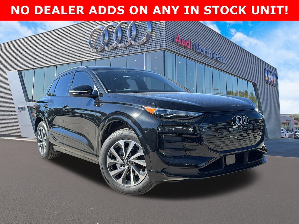 Audi North Park is honored to offer this charming 2025 Audi Q6 e-tron Premium. Well equipped with 10 Speakers, 4-Wheel Disc Brakes, ABS brakes, Air Conditioning, Alloy wheels, Auto High-beam Headlights, Auto-dimming door mirrors, Auto-dimming Rear-View mirror, Automatic temperature control, Brake assist, Bumpers: body-color, Compass, Delay-off headlights, Driver door bin, Driver vanity mirror, Dual front impact airbags, Dual front side impact airbags, Electronic Stability Control, Emergency communication system: Audi connect CARE (limited time subscription - acceptance of terms required), Exterior Parking Camera Rear, Four wheel independent suspension, Front anti-roll bar, Front Bucket Seats, Front Center Armrest, Front dual zone A/C, Front reading lights, Fully automatic headlights, Garage door transmitter: HomeLink, Genuine wood dashboard insert, Heated door mirrors, Heated Front Seats, Heated front seats, Illuminated entry, Leather Seating Surfaces, Leather steering wheel, Low tire pressure warning, Memory seat, Navigation system: MMI Navigation plus, Occupant sensing airbag, Outside temperature display, Overhead airbag, Overhead console, Panic alarm, Passenger door bin, Passenger vanity mirror, Power door mirrors, Power driver seat, Power Liftgate, Power passenger seat, Power steering, Power windows, Radio data system, Radio: Audi Sound System, Rain sensing wipers, Rear air conditioning, Rear anti-roll bar, Rear reading lights, Rear seat center armrest, Rear side impact airbag, Rear window defroster, Rear window wiper, Remote keyless entry, Security system, Speed control, Speed-sensing steering, Split folding rear seat, Spoiler, Steering wheel memory, Steering wheel mounted audio controls, Telescoping steering wheel, Tilt steering wheel, Traction control, Trip computer, Turn signal indicator mirrors, Variably intermittent wipers, and Wheels: 19 5-Double-Spoke Dynamic Design.