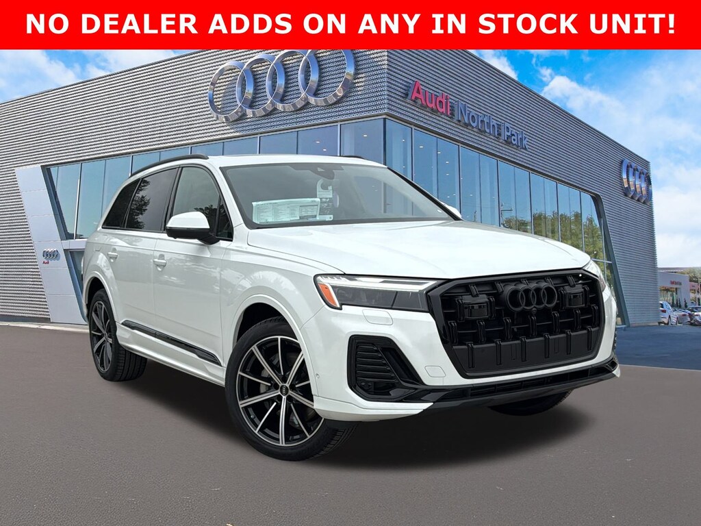 Audi North Park is pumped up to offer this superb 2026 Audi Q7 45 Premium Plus. Well equipped with 10 Speakers, 3rd row seats: bench, 4-Wheel Disc Brakes, ABS brakes, Air Conditioning, Alloy wheels, AM/FM radio: SiriusXM with 360L, Auto High-beam Headlights, Auto-dimming door mirrors, Auto-dimming Rear-View mirror, Automatic temperature control, Brake assist, Bumpers: body-color, Compass, Delay-off headlights, Driver door bin, Driver vanity mirror, Dual front impact airbags, Dual front side impact airbags, Electronic Stability Control, Emergency communication system: Audi connect CARE, Exterior Parking Camera Rear, Four wheel independent suspension, Front anti-roll bar, Front Bucket Seats, Front Center Armrest, Front dual zone A/C, Front fog lights, Front reading lights, Fully automatic headlights, Garage door transmitter: HomeLink, Genuine wood door panel insert, Heated door mirrors, Heated Front Bucket Seats, Heated front seats, Illuminated entry, Leather Seating Surfaces, Leather Shift Knob, Leather steering wheel, Low tire pressure warning, Memory seat, Navigation system: Audi MMI Navigation plus with Touch Response, Occupant sensing airbag, Outside temperature display, Overhead airbag, Overhead console, Panic alarm, Passenger door bin, Passenger vanity mirror, Power door mirrors, Power driver seat, Power Liftgate, Power moonroof: Panoramic, Power passenger seat, Power steering, Power windows, Radio data system, Radio: Audi Sound System, Rain sensing wipers, Rear air conditioning, Rear anti-roll bar, Rear fog lights, Rear reading lights, Rear seat center armrest, Rear side impact airbag, Rear window defroster, Rear window wiper, Reclining 3rd row seat, Remote keyless entry, Security system, Speed control, Speed-sensing steering, Split folding rear seat, Spoiler, Steering wheel memory, Steering wheel mounted audio controls, Tachometer, Telescoping steering wheel, Tilt steering wheel, Traction control, Trip computer, Turn signal indicator mirrors, Variably intermittent wipers, and Wheels: 19 5-Arm-Star Design.