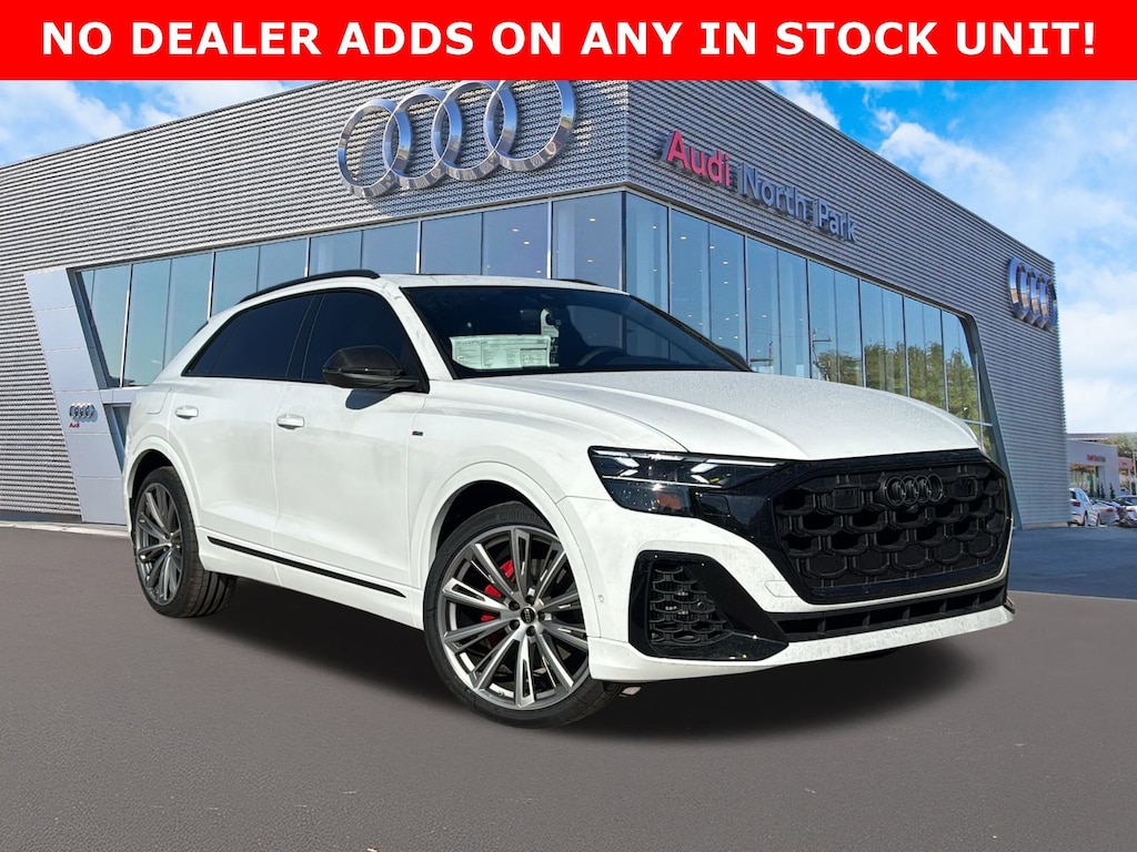 Audi North Park is pleased to offer this terrific-looking 2026 Audi Q8 . Well equipped with 10 Speakers, 4-Wheel Disc Brakes, ABS brakes, Adaptive suspension, Air Conditioning, Alloy wheels, AM/FM radio, Audi Sound System, Auto High-beam Headlights, Auto-dimming door mirrors, Auto-dimming Rear-View mirror, Automatic temperature control, Brake assist, Bumpers: body-color, Compass, Delay-off headlights, Driver door bin, Driver vanity mirror, Dual front impact airbags, Dual front side impact airbags, Electronic Stability Control, Emergency communication system: Audi connect CARE, Exterior Parking Camera Rear, Four wheel independent suspension, Front anti-roll bar, Front Bucket Seats, Front Center Armrest, Front dual zone A/C, Front fog lights, Front reading lights, Fully automatic headlights, Garage door transmitter: HomeLink, Genuine wood door panel insert, Heated door mirrors, Heated Front Bucket Seats, Heated front seats, Illuminated entry, Leather Seating Surfaces, Leather Shift Knob, Leather steering wheel, Low tire pressure warning, Memory seat, Navigation system: Audi MMI Navigation plus with Touch Response, Occupant sensing airbag, Outside temperature display, Overhead airbag, Overhead console, Panic alarm, Passenger door bin, Passenger vanity mirror, Power door mirrors, Power driver seat, Power Liftgate, Power moonroof: Panoramic, Power passenger seat, Power steering, Power windows, Radio data system, Radio: Audi MMI Navigation Plus with MMI Touch Response, Rain sensing wipers, Rear air conditioning, Rear anti-roll bar, Rear fog lights, Rear reading lights, Rear seat center armrest, Rear side impact airbag, Rear window defroster, Rear window wiper, Remote keyless entry, Security system, Speed control, Speed-sensing steering, Split folding rear seat, Spoiler, Steering wheel memory, Steering wheel mounted audio controls, Tachometer, Telescoping steering wheel, Tilt steering wheel, Traction control, Trip computer, Turn signal indicator mirrors, Variably intermittent wipers, and Wheels: 21 5-W-Spoke Design with Bicolor Finish.