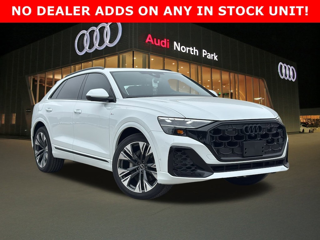 Audi North Park is pumped up to offer this stunning 2026 Audi Q8 . Well equipped with 10 Speakers, 4-Wheel Disc Brakes, ABS brakes, Adaptive suspension, Air Conditioning, Alloy wheels, AM/FM radio, Audi Sound System, Auto High-beam Headlights, Auto-dimming door mirrors, Auto-dimming Rear-View mirror, Automatic temperature control, Brake assist, Bumpers: body-color, Compass, Delay-off headlights, Driver door bin, Driver vanity mirror, Dual front impact airbags, Dual front side impact airbags, Electronic Stability Control, Emergency communication system: Audi connect CARE, Exterior Parking Camera Rear, Four wheel independent suspension, Front anti-roll bar, Front Bucket Seats, Front Center Armrest, Front dual zone A/C, Front fog lights, Front reading lights, Fully automatic headlights, Garage door transmitter: HomeLink, Genuine wood door panel insert, Heated door mirrors, Heated Front Bucket Seats, Heated front seats, Illuminated entry, Leather Seating Surfaces, Leather Shift Knob, Leather steering wheel, Low tire pressure warning, Memory seat, Navigation system: Audi MMI Navigation plus with Touch Response, Occupant sensing airbag, Outside temperature display, Overhead airbag, Overhead console, Panic alarm, Passenger door bin, Passenger vanity mirror, Power door mirrors, Power driver seat, Power Liftgate, Power moonroof: Panoramic, Power passenger seat, Power steering, Power windows, Radio data system, Radio: Audi MMI Navigation Plus with MMI Touch Response, Rain sensing wipers, Rear air conditioning, Rear anti-roll bar, Rear fog lights, Rear reading lights, Rear seat center armrest, Rear side impact airbag, Rear window defroster, Rear window wiper, Remote keyless entry, Security system, Speed control, Speed-sensing steering, Split folding rear seat, Spoiler, Steering wheel memory, Steering wheel mounted audio controls, Tachometer, Telescoping steering wheel, Tilt steering wheel, Traction control, Trip computer, Turn signal indicator mirrors, Variably intermittent wipers, and Wheels: 21 5-W-Spoke Design with Bicolor Finish.