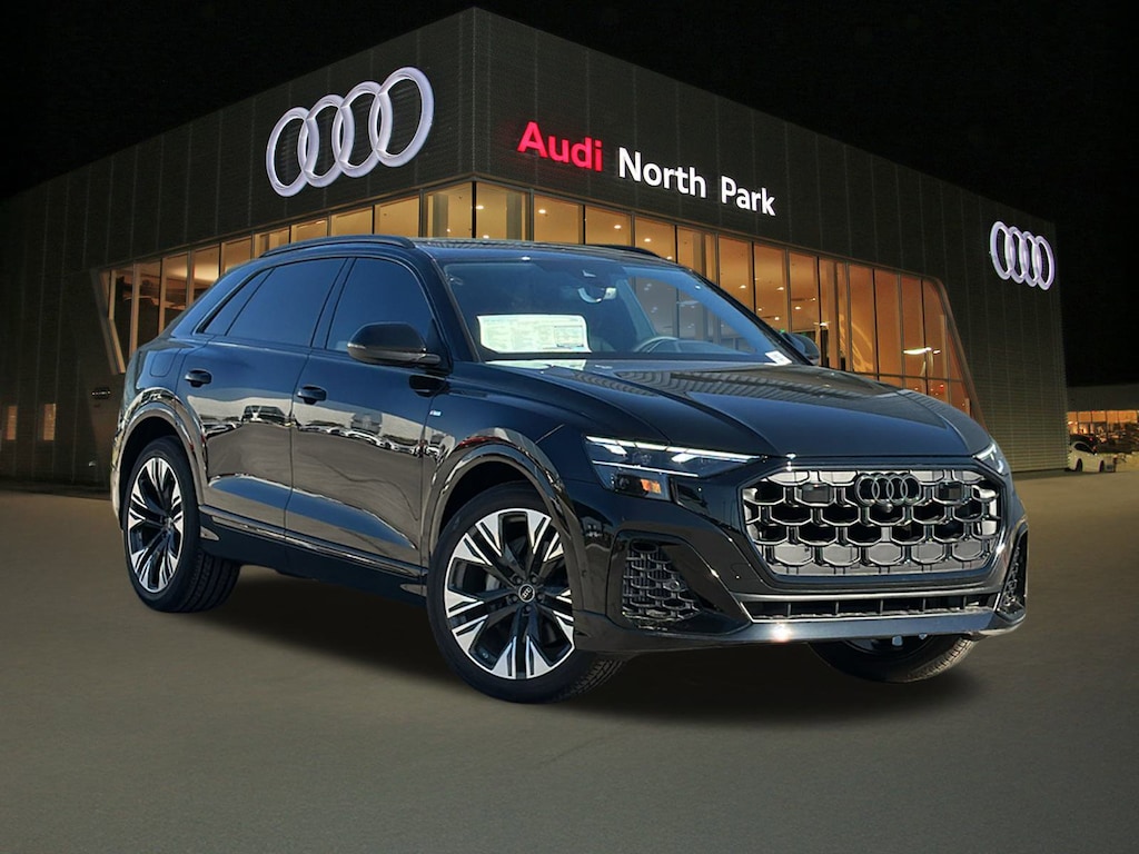 Audi North Park is proud to offer this stunning-looking 2026 Audi Q8 . Well equipped with 10 Speakers, 4-Wheel Disc Brakes, ABS brakes, Adaptive suspension, Air Conditioning, Alloy wheels, AM/FM radio, Audi Sound System, Auto High-beam Headlights, Auto-dimming door mirrors, Auto-dimming Rear-View mirror, Automatic temperature control, Brake assist, Bumpers: body-color, Compass, Delay-off headlights, Driver door bin, Driver vanity mirror, Dual front impact airbags, Dual front side impact airbags, Electronic Stability Control, Emergency communication system: Audi connect CARE, Exterior Parking Camera Rear, Four wheel independent suspension, Front anti-roll bar, Front Bucket Seats, Front Center Armrest, Front dual zone A/C, Front fog lights, Front reading lights, Fully automatic headlights, Garage door transmitter: HomeLink, Genuine wood door panel insert, Heated door mirrors, Heated Front Bucket Seats, Heated front seats, Illuminated entry, Leather Seating Surfaces, Leather Shift Knob, Leather steering wheel, Low tire pressure warning, Memory seat, Navigation system: Audi MMI Navigation plus with Touch Response, Occupant sensing airbag, Outside temperature display, Overhead airbag, Overhead console, Panic alarm, Passenger door bin, Passenger vanity mirror, Power door mirrors, Power driver seat, Power Liftgate, Power moonroof: Panoramic, Power passenger seat, Power steering, Power windows, Radio data system, Radio: Audi MMI Navigation Plus with MMI Touch Response, Rain sensing wipers, Rear air conditioning, Rear anti-roll bar, Rear fog lights, Rear reading lights, Rear seat center armrest, Rear side impact airbag, Rear window defroster, Rear window wiper, Remote keyless entry, Security system, Speed control, Speed-sensing steering, Split folding rear seat, Spoiler, Steering wheel memory, Steering wheel mounted audio controls, Tachometer, Telescoping steering wheel, Tilt steering wheel, Traction control, Trip computer, Turn signal indicator mirrors, Variably intermittent wipers, and Wheels: 21 5-W-Spoke Design with Bicolor Finish.