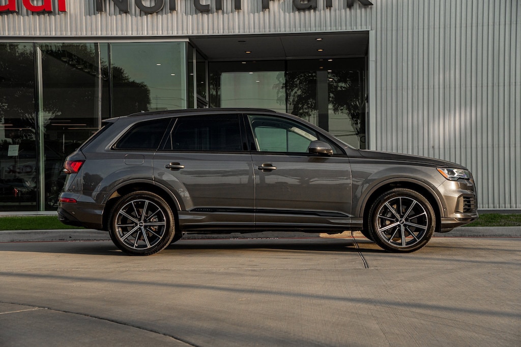 Audi North Park is delighted to offer this charming 2021 Audi Q7 55 Premium Plus. Well equipped with Black Optic Exterior Package (Black Door Blades, Black Front & Rear Bumper Inserts, Black Grille, Black Roof Rails, and Black Window Surrounds), Black Optic Package (Wheels: 21 10-Spoke Star-Design Bi-Color Black), 10 Speakers, 3.204 Axle Ratio, 3rd row seats: bench, 4-Wheel Disc Brakes, ABS brakes, Air Conditioning, Alloy wheels, AM/FM radio: SiriusXM, Audi smartphone interface (Apple CarPlay/Android Auto), Auto High-beam Headlights, Auto-dimming Rear-View mirror, Automatic temperature control, Brake assist, Bumpers: body-color, Compass, Delay-off headlights, Driver door bin, Driver vanity mirror, Dual front impact airbags, Dual front side impact airbags, Electronic Stability Control, Emergency communication system: Audi connect CARE, PRIME & PLUS, Exterior Parking Camera Rear, Four wheel independent suspension, Front anti-roll bar, Front Bucket Seats, Front Center Armrest, Front dual zone A/C, Front fog lights, Front reading lights, Fully automatic headlights, Garage door transmitter: HomeLink, Genuine wood door panel insert, Heated door mirrors, Heated Front Bucket Seats, Heated front seats, Illuminated entry, Leather Seating Surfaces, Leather Shift Knob, Leather steering wheel, Low tire pressure warning, Memory seat, Navigation system: Audi MMI Navigation plus with Touch Response, Occupant sensing airbag, Outside temperature display, Overhead airbag, Overhead console, Panic alarm, Passenger door bin, Passenger vanity mirror, Power door mirrors, Power driver seat, Power Liftgate, Power moonroof, Power passenger seat, Power steering, Power windows, Radio data system, Radio: Audi Sound System, Rain sensing wipers, Rear air conditioning, Rear anti-roll bar, Rear fog lights, Rear reading lights, Rear seat center armrest, Rear window defroster, Rear window wiper, Reclining 3rd row seat, Remote keyless entry, Roof rack: rails only, Security system, Speed control, Speed-sensing steering, Split folding rear seat, Spoiler, Steering wheel memory, Steering wheel mounted audio controls, Tachometer, Telescoping steering wheel, Tilt steering wheel, Traction control, Trip computer, Turn signal indicator mirrors, Variably intermittent wipers, and Wheels: 19 5-Arm-Star Design.